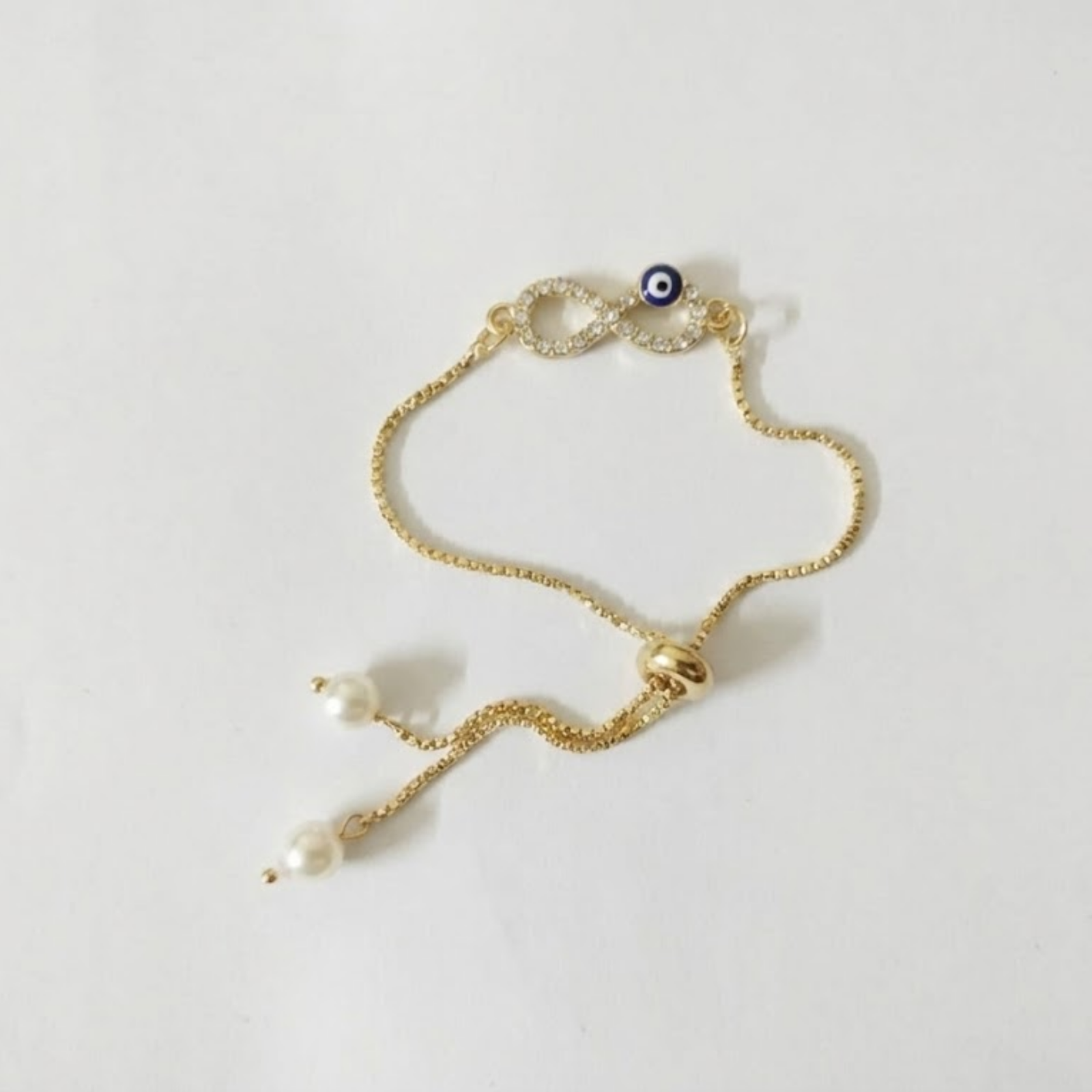 Add a stylish and protective touch to any outfit with this gold-color adjustable chain bracelet, designed for women and girls who love elegant and meaningful jewelry. Crafted with a polished gold-tone finish, it features a delicate chain that can be easily adjusted for a perfect fit. The combination of the evil eye charm and pearl accents creates a chic yet symbolic design, making it ideal for daily wear, special occasions, or gifting. Lightweight, versatile, and beautifully detailed, this bracelet adds a refined charm to both casual and dressy looks.