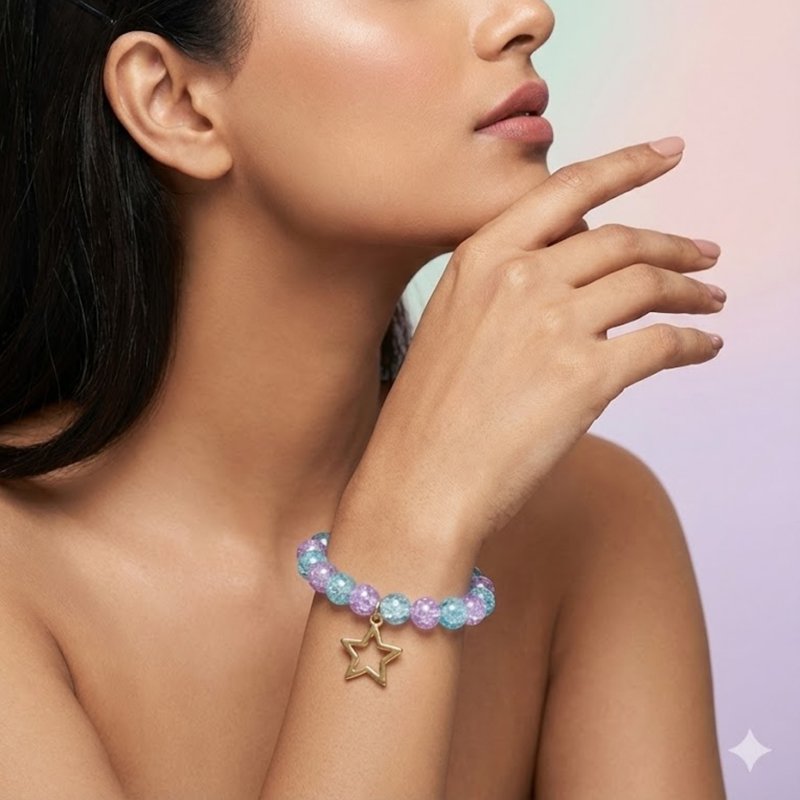 Brighten up any look with this purple and blue crackle bead stretch bracelet, designed for girls, teens, and women who love vibrant, stylish accessories. The crackle beads offer a shimmering, eye-catching finish, while the flexible elastic band provides a comfortable fit for everyday wear. Finished with a cute star charm, this bracelet adds a fun, dreamy touch?perfect for school, outings, casual outfits, or stacking with other bracelets. Lightweight, colorful, and charming, it also makes a wonderful star-themed gift for any occasion.